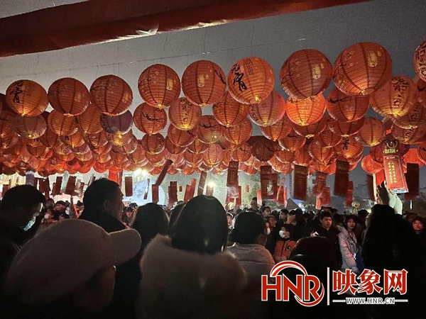 一排排灯笼鲜艳喜庆,一条条彩色的灯谜引起了大家浓厚的兴趣。灯谜内容广泛,既有通俗易懂的趣味猜题,也有较为复杂的抽象谜题,既具娱乐性,又具知识性。人们欢聚在活动广场上,穿梭在五颜六色的灯谜中间,或认真思考或热烈讨论,热情高涨、竞相猜谜,欢声笑语充满了活动现场。